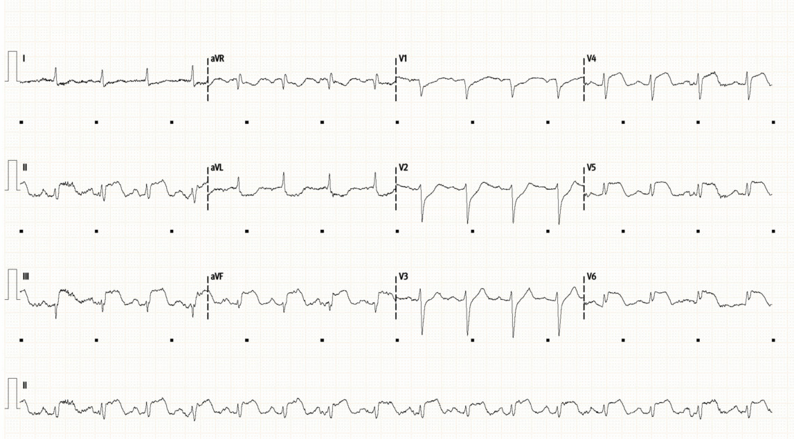 This is a concerning ECG. Rhythm is sinus with a rate of around 95/min.